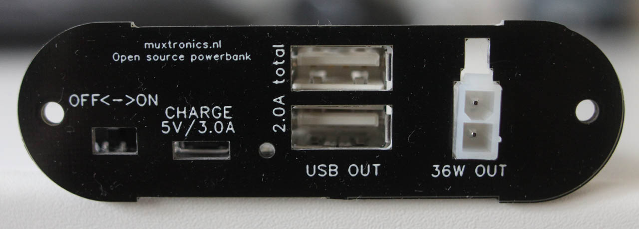 This is a comprehensive technical manual for the programmable Muxtronics Powerbank. This powerbank supersedes the non-programmable 12V powerbank. This powerbank outputs - as you expect - 5V/2A to charge regular mobile devices, but also outputs 12V/3A on the 'HV' port to charge large tablets or be used as a UPS (Uninterruptible Power Supply) for e.g. Raspberry Pi, networking equipment, etc. The UPS functionality means the powerbank can charge and output at the same time. Maximum draw to maintain battery level is 12.5W (avg.).