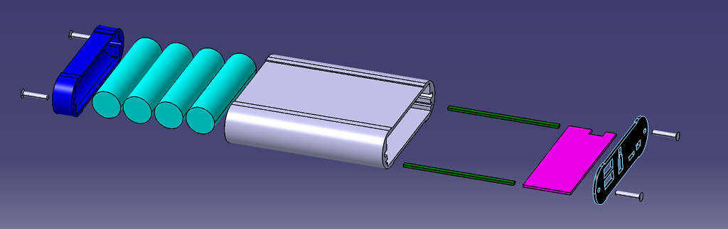 The powerbank reference design consists of the following parts (color-coded in the exploded view):